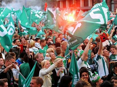 Auch die Fans beim Public-Viewing in Bremen feiern den Pokal begeistert