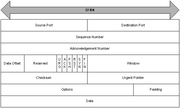 Das TCP/IP-Protokoll bietet einen sicheren (reliable) und verbindungsorientierten Service. Der Header enthält u.a. eine Sequenznummer, ein acknowledgement und ein checksum-Feld. Diese Felder sind für einen sicheren Transport (Paketbestätigung) und für die Fehlerkontrolle (Checksum) notwendig. Die beiden Felder “Source Port” und “Destination Port” indentifizieren die Applikation, welche den TCP-Service benutzt. Das “Port-Feld” ist 16 Bit lang, es gibt also 65’535 verschiedene Portnummern.